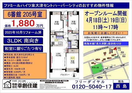 オープンハウスのご案内 4月18日(土)・19日(日)の2日間、泉大津市のマンション【セントハーバーシティ6番館】にてオープンハウスを開催いたします。不動産購入・リフォーム、補助金相談会も同時開催いたします。ぜひ、お気軽にお越しください。詳しくは下記チラシをクリックしてご覧ください。